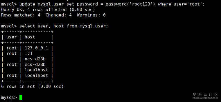 mysql> ALTER USER 'root'@'localhost' IDENTIFIED BY '你的新密码'; mysql> use mysql; mysql> update user set host = '%' where user = 'root'; mysql> FLUSH PRIVILEGES;
