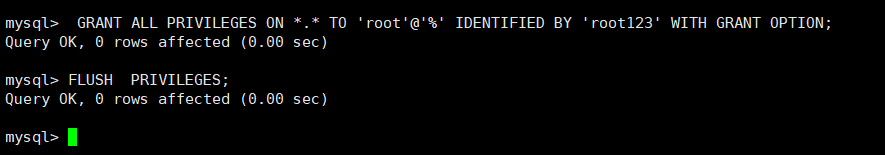 GRANT ALL PRIVILEGES ON *.* TO 'root'@'%' IDENTIFIED BY 'root123' WITH GRANT OPTION; FLUSH PRIVILEGES;