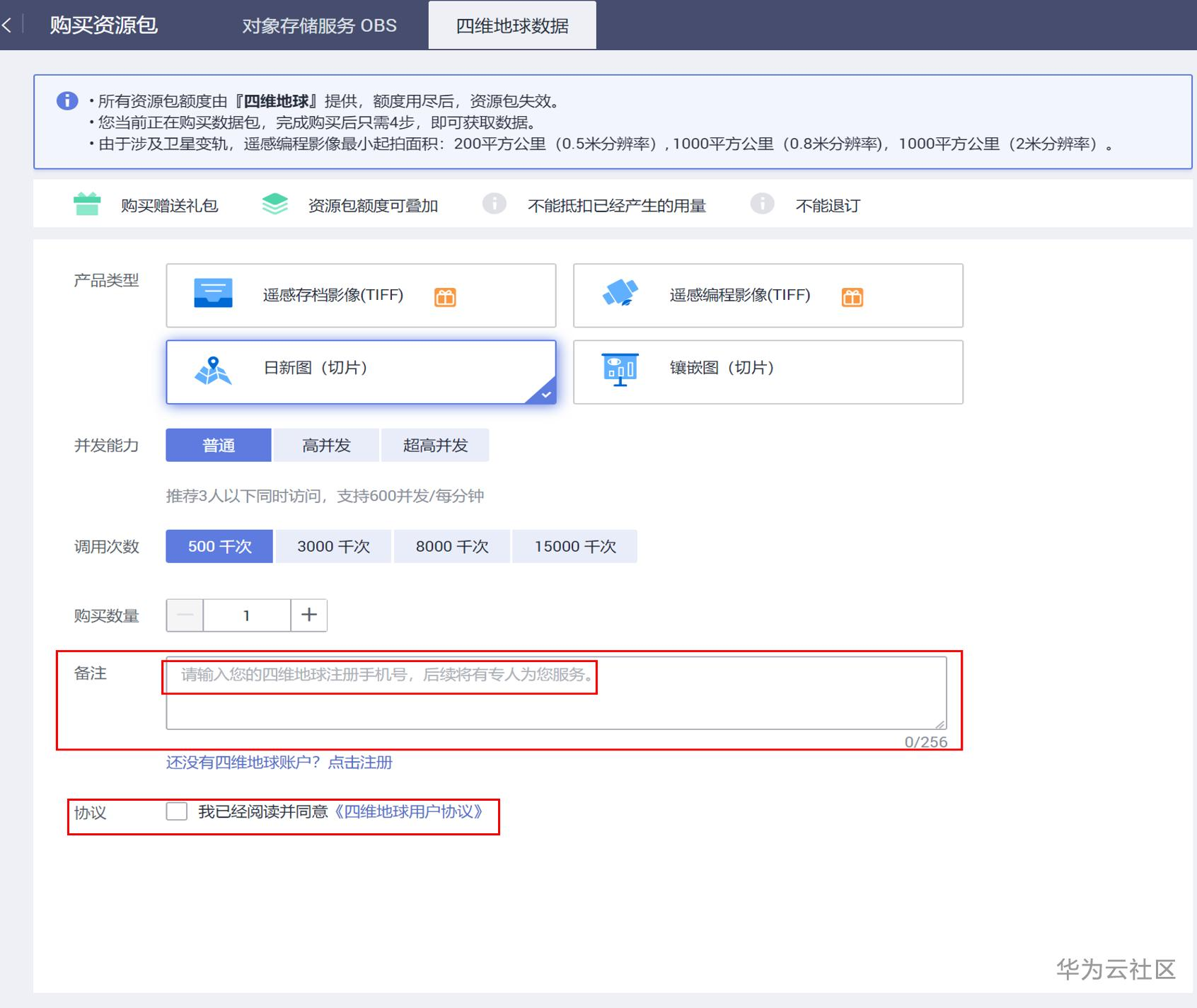 b) 进入购买主页面(https://console.huaweicloud.cn/console/#/obs/buy),进入“四维地球数据”购买页;