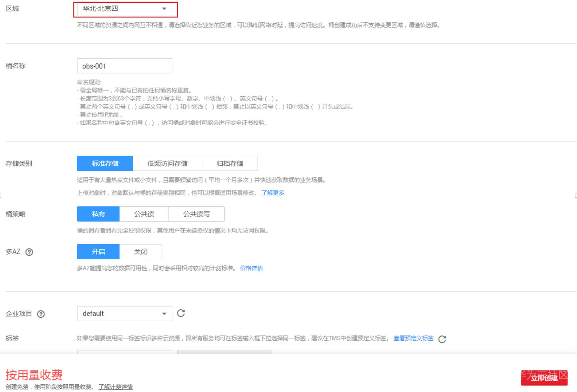 d) “区域”选择——“华北-北京四”(为四维地球遥感数据所在区域)、“存储类别”选择“标准存储”,并输入“桶名称”。