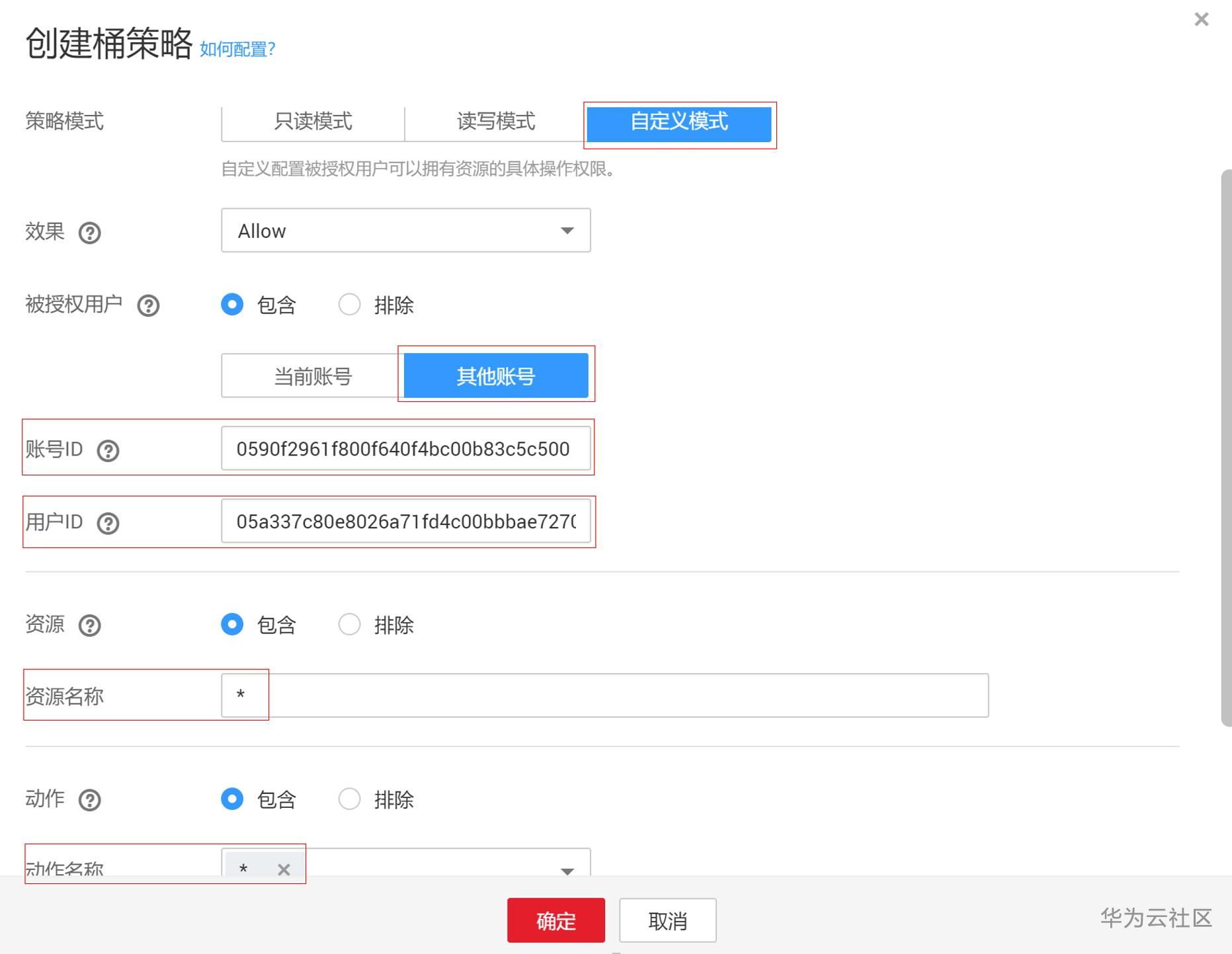 d) 单击“创建桶策略”,选择“自定义”策略模式,被授权用户选择“包含”,选择“其他账号”,账号ID填写四维地球的账号ID:“0590f2961f800f640f4bc00b83c5c500”,用户ID填写四维地球的用户ID:“05a337c80e8026a71fd4c00bbbae7270”;资源选择“包含”,资源名称填写“*”;动作选择“包含”,动作名称选择 General ->“*”,点击“确定”;