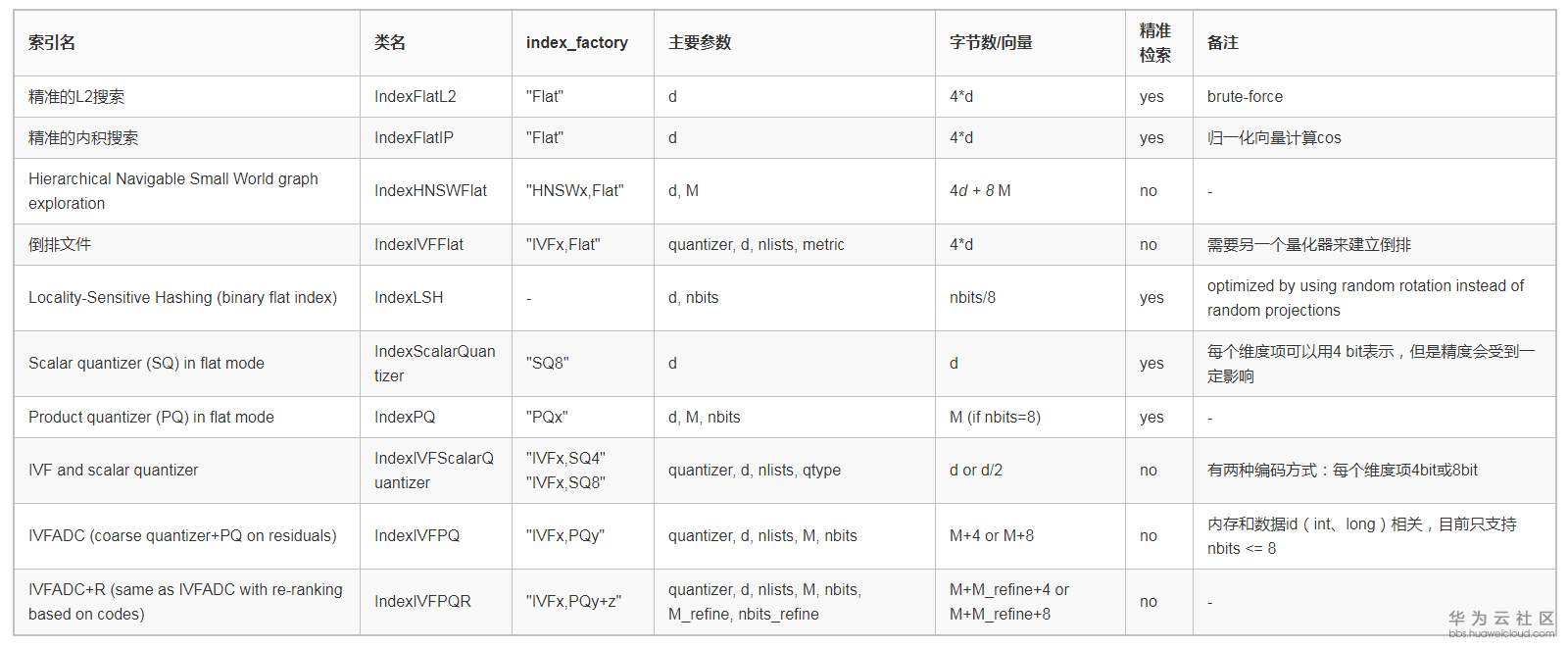 以下都通过 index_factory 字符串来表示不同 Index,如果需要参数,使用相应的 ParameterSpace 参数