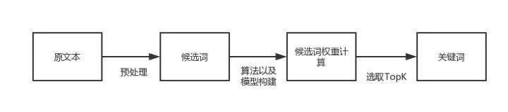 有监督的文本关键词提取算法需要高昂的人工成本,因此现有的文本关键词提取主要采用适用性较强的无监督关键词抽取。其文本关键词抽取流程如下