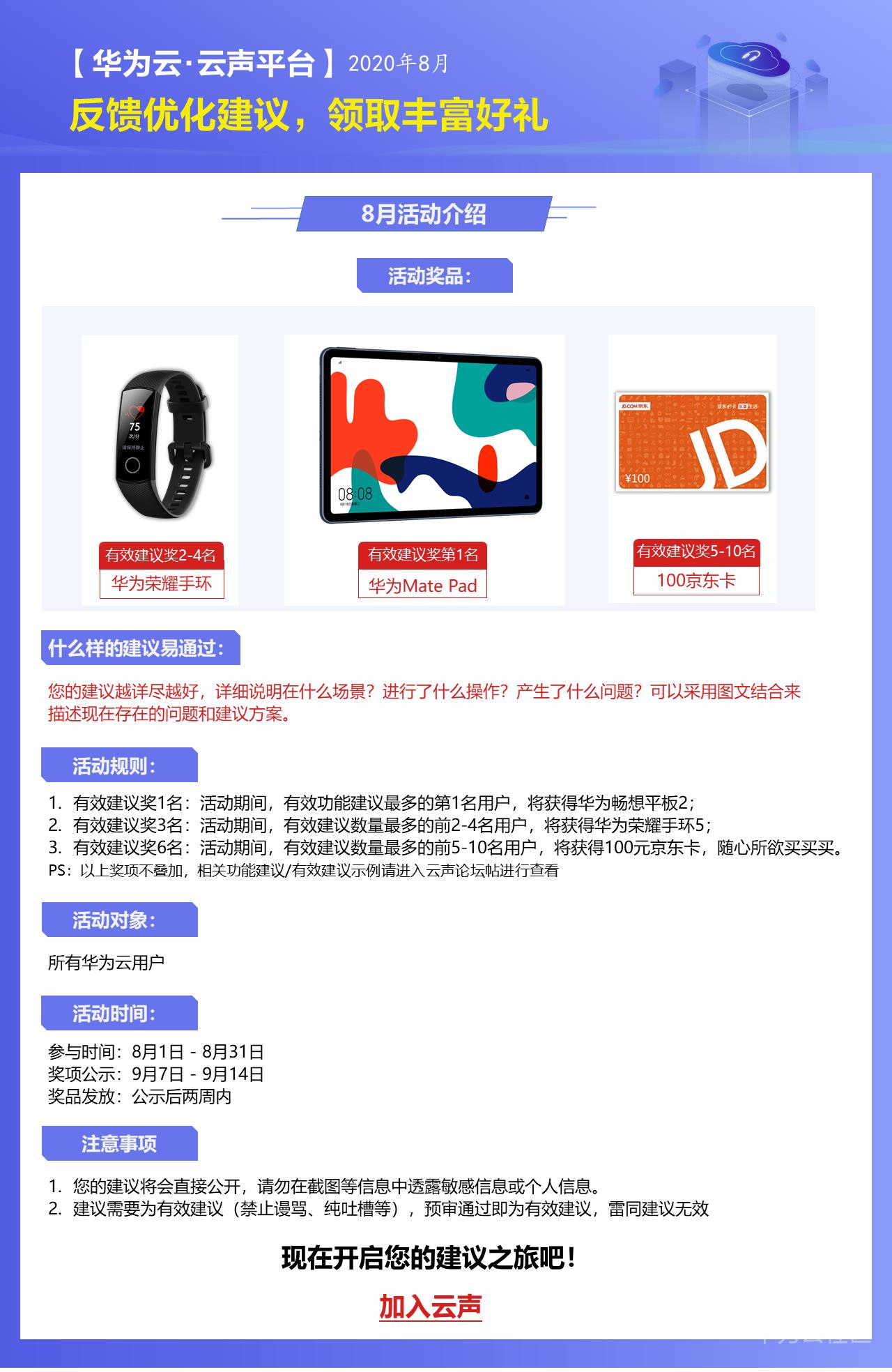 【华为云▪云声平台 】反馈优化建议,领取丰富好礼(2020年8月)