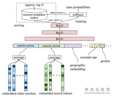 如上图 1 所示主要思想是把softmax的前一层的输出作为user的embedding,而softmax层中的权重矩阵的每一行向量作为video的embedding,这样在模型的部署过程中,就没有必要部署整个神经网络来完成从原始特征向量到最终输出的预测过程,只需要将User Embedding和video Embedding存储到线上内存数据库,通过内积运算再排序的方法就可以得到video的排名,这大大加快了召回效率。