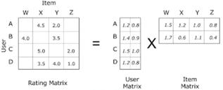 通过将用户对物品的打分矩阵Rating Matrix分解成User Matrix和Item Matrix两个矩阵相乘,我们可以把User Matrix和Item Matrix相乘分别看作是A,B,C,D四个user embedding和W,X,Y,Z四个item embedding相乘。