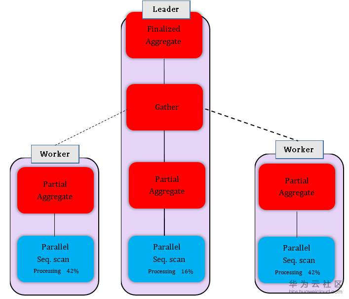 为了解释并行查询执行代价,我们首先看看不同进程(为什么用进程是历史原因)之间工作量的分配。当并发进程只有两个的时候,主进程需要将大部分时间花费在执行工作,当并行进程的增加,主进程逐渐将工作转向聚合部分结果。Pg的进程工作量分配正是建立在这个基础之上。具体的分配算法见代码片段7第22行-27行。并行执行的框架如图1所示。