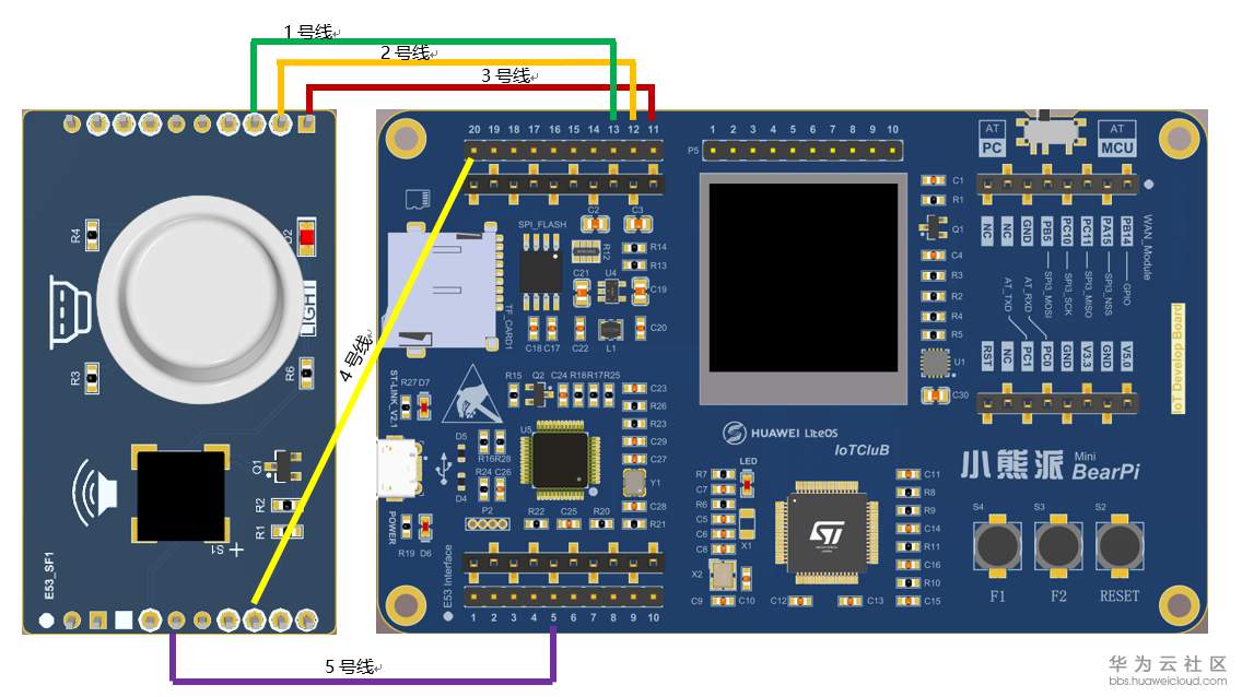 将烟雾扩展板用杜邦线接到小熊派开发板上,如图所示: