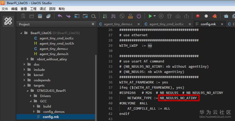 打开“config.mk”文件,修改通信方式“NETWORK_TYPE”为NB-IoT通信方式“NB_NEUL95_NO_ATINY”,点击“保存”;