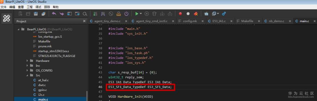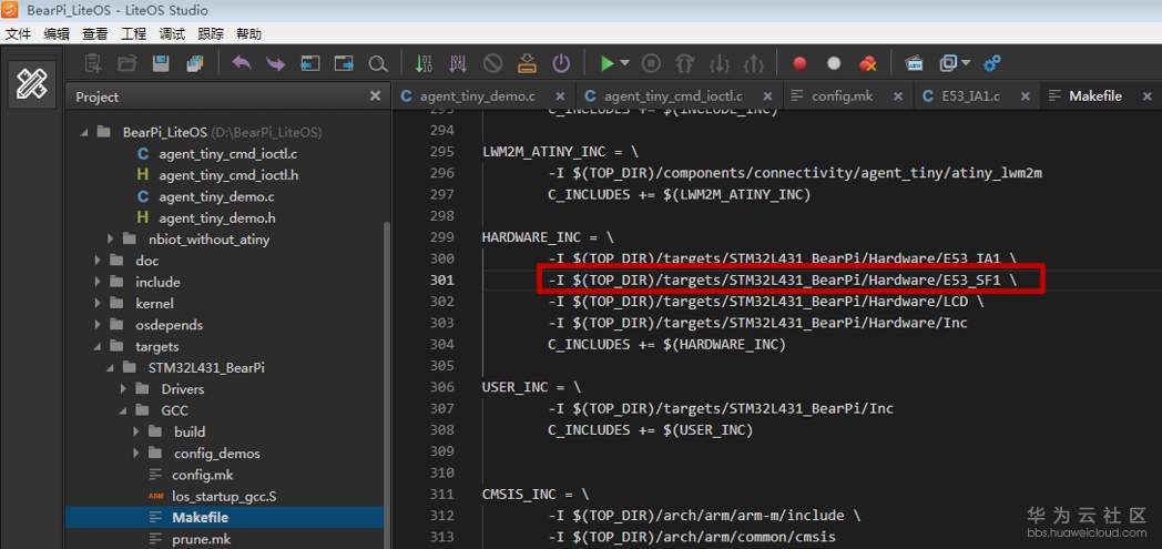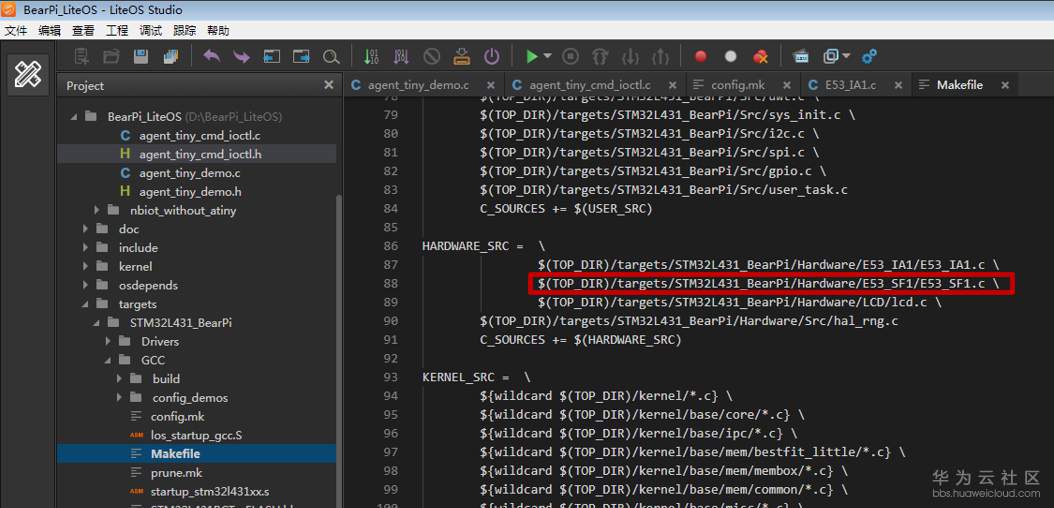 在“Makefile”文件中,添加移植智慧烟感传感器E53_SF1的代码;