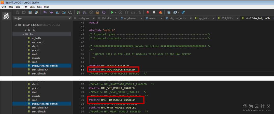 打开“stm32l4xx_hal_conf.h”文件,打开“HAL_ADC_MODULE_ENABLED”和“HAL_TIM_MODULE_ENABLED”的宏定义的注释;