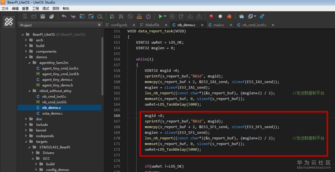 在“nb_demo.c”的数据上报任务中, 添加发送烟感数据上报的代码,点击“保存”;