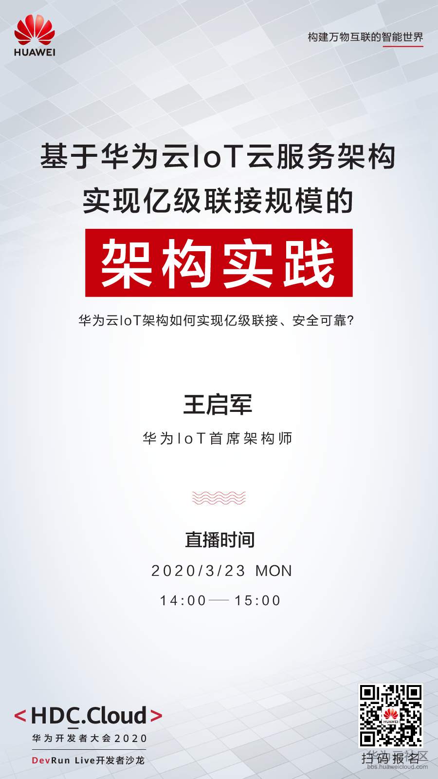 在3月23日第五期的华为DevRun Live开发者沙龙中,华为云IoT首席架构师王启军将分享《基于华为云 IoT云服务架构,实现亿级联接规模的架构实践》,带你了解华为云IoT云服务架构设计实践、架构演变过程、最终实现华为云IoT云服务亿级联接、百万高并发、安全可靠。