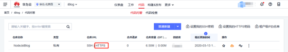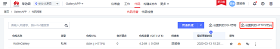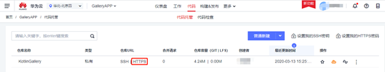 需要指出的是本处使用HTTPS方式访问代码仓库。代码仓库的HTTPS地址可以从DevCloud CodeHub的代码仓库列表中获取,如下图所示: