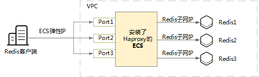 如下图所示,安装了Haproxy代理工具、并绑定了弹性IP的ECS就是一台跳板机,Redis客户端访问Haproxy的监听端口,Haproxy将请求内容转发到不同的Redis实例。