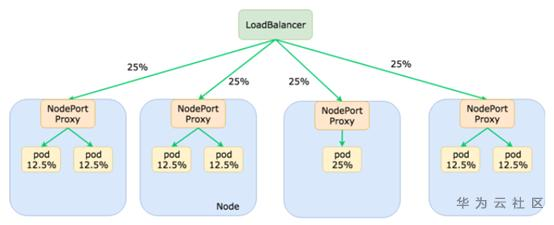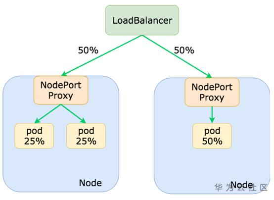 不过流量还是会不太均衡,如上图,Loadbalancer看到的是2个后端(把节点的IP),每个Node上面几个Pod对Loadbalancer来说是不知道的。