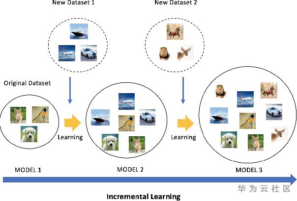 为了解决这些问题,使得增加模型可识别的类别数量更容易一些,近年来学术界中出现了一些针对深度学习的“增量式学习”算法。这类算法有三点主要的假设:(1)不同类别的数据是分批次提供给算法模型进行学习的,如下图所示;(2)系统的存储空间有限,至多只能保存一部分历史数据,无法保存全部历史数据,这一点比较适用于手机、PC机等应用场景;(3)在每次提供的数据中,新类别的数据量比较充足。