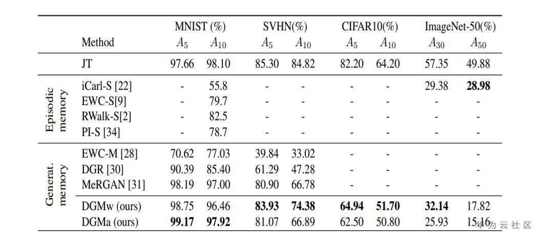这篇文章提出了一种基于GAN的增量式学习方法,如上图所示。其中判别器(D)部分的设计与ACGAN基本相同,包括对抗损失和分类损失两部分;生成器的结构则比较特殊。具体来说,本文提出的生成器除了需要学习生成器的权重之外,还要对每一层的权重学习一个mask。这个mask的作用是限制每次允许更新的权重,从而防止模型忘记之前学习到的东西。由于mask的存在,模型越往后可以更新的权重值也会越少,因此可能会导致生成器的生成能力不足。为了解决这个问题,作者提出在每次学习完新数据之后,增加生成器的参数量,从而保证生成器的生成能力不会明显下降。实验结果显示,在小规模的数据集上,该方法有比较明显的性能优势,如下表所示。