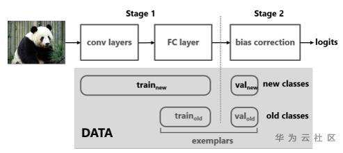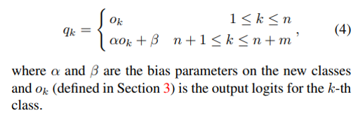 具体来说,本文方法需要保存一定数量的旧类别的代表性样本,在得到新类别数据的时候,包含三步操作:第一步,将旧类别的代表性样本和新类别的样本划分为训练集和校验集,其中在校验集里,各类的样本数量是均衡的;第二步,使用训练样本训练一个新模型,其中包含两部分损失,一个是标准的分类损失,另一个是知识蒸馏损失,目标是保证新模型在旧类别上的概率预测值和旧模型尽可能相同,从而保留旧模型学到的信息(新类别和旧类别的样本都参与计算两个损失);第三步,使用校验集的数据学习一个线性模型,对新模型预测的logits进行修正,其中保留旧类别上的logits,只对新类别上的logits进行修正,如下边的公式所示。