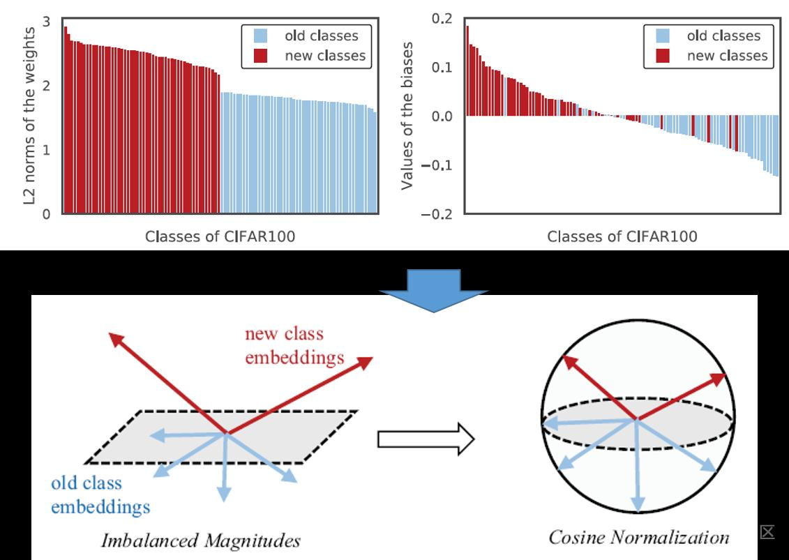 这篇文章根据现有增量学习算法的问题,提出了三点改进,如上图所示:第一,作者发现,由于新类的特征向量幅值和旧类的不一样,因此模型会偏向于新类。为了解决这个问题,提出对特征向量、分类器的权重向量进行归一化,保证幅值等于1。相应的,分类损失和蒸馏损失也都在归一化之后的特征向量上使用,如下图所示;