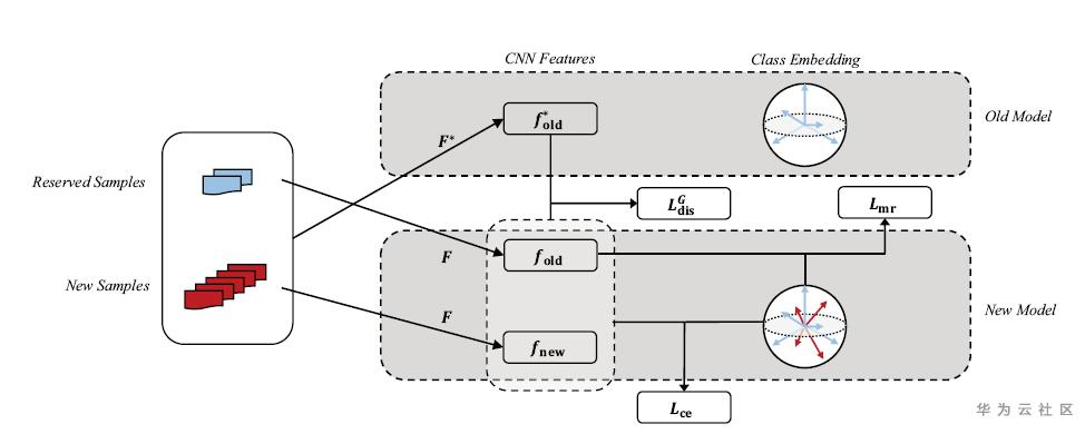 第二,为了减少模型遗忘,要求新模型的归一化特征和旧模型尽量相同,因此提出了一种新的蒸馏损失。这个损失的思想是,旧模型学到的不同类别的特征分布一定程度上反映了类别之间的关系,因此保持这种关系对于防止遗忘也有意义,如下图所示;