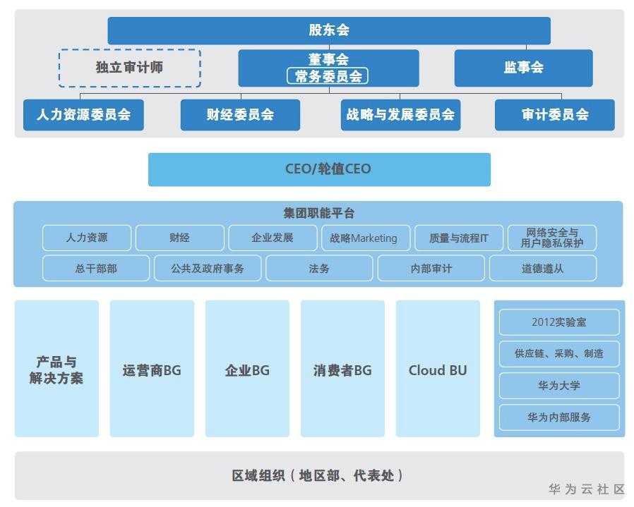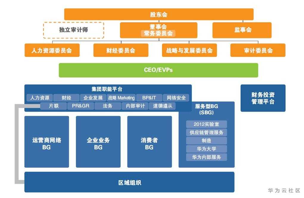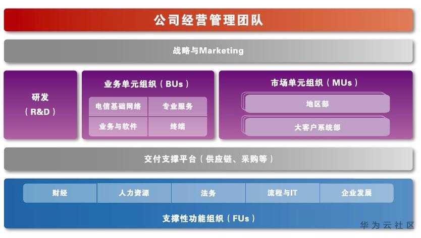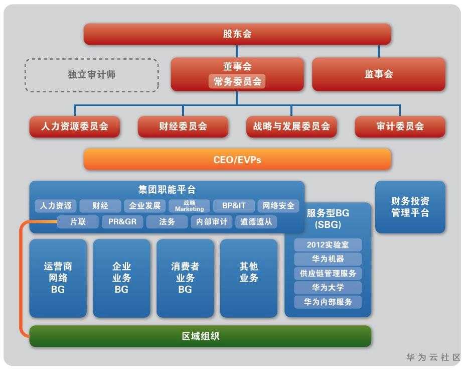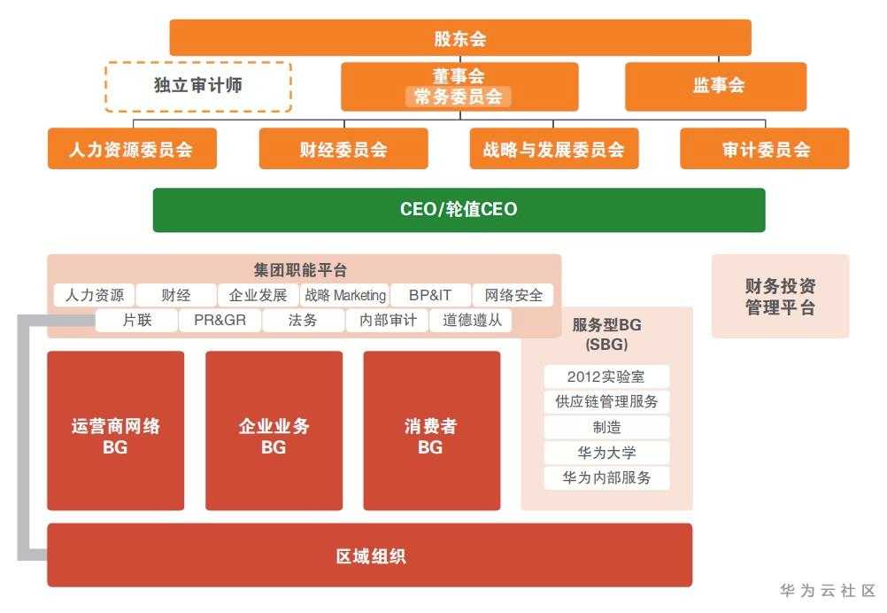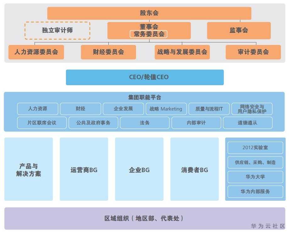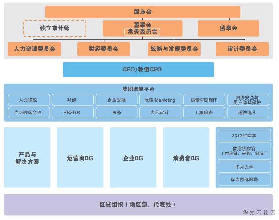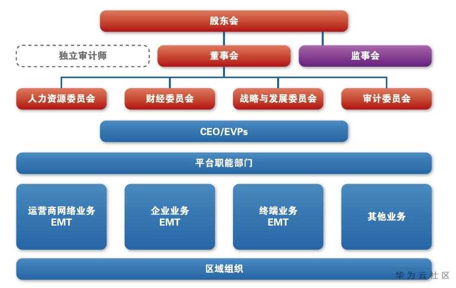 到了2010年的时候,华为成立了企业业务EMT(经营管理团队),开始从运营商客户群体向企业客户群体发展。这一年,原有的市场单元组织变为了平台级的区域组织,区域组织逐步转变为对一线业务单元支持、服务和监管的平台,各业务运营中心在区域平台上以客户为中心开展各自的经营活动。2010年,华为组织架构最大的变化是凸显了董事会与监事会,强化了现代化的企业管理与治理。