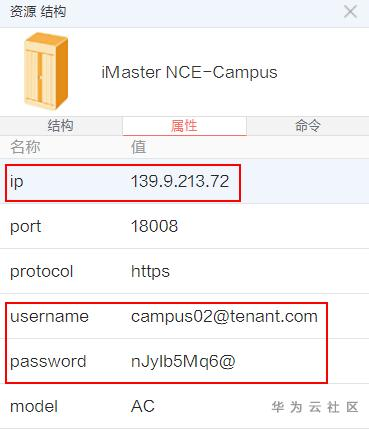 单击iMaster NCE-Campus图标,在“属性”页签获取iMaster NCE-Campus 的IP、用户名和密码(使用此用户名和密码登录iMaster NCE-Campus,用于创建北向用户)。