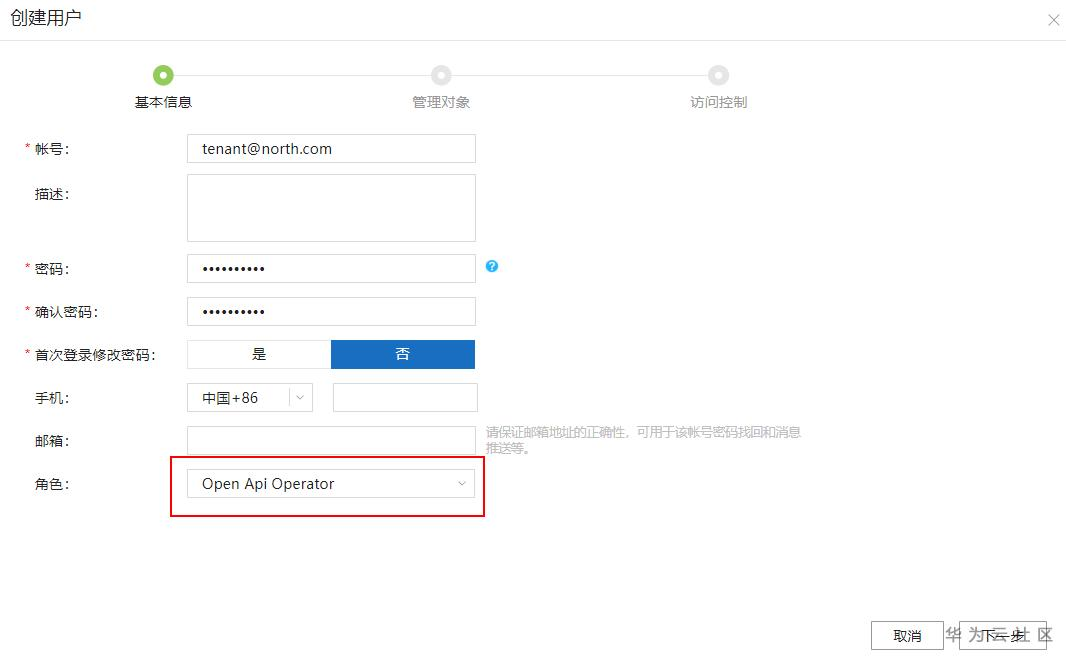 选择“系统 > 系统管理 > 管理员”,在“用户”页签中单击“创建”,创建Open Api Operator帐号。请将“首次登录修改密码”选择“否”。