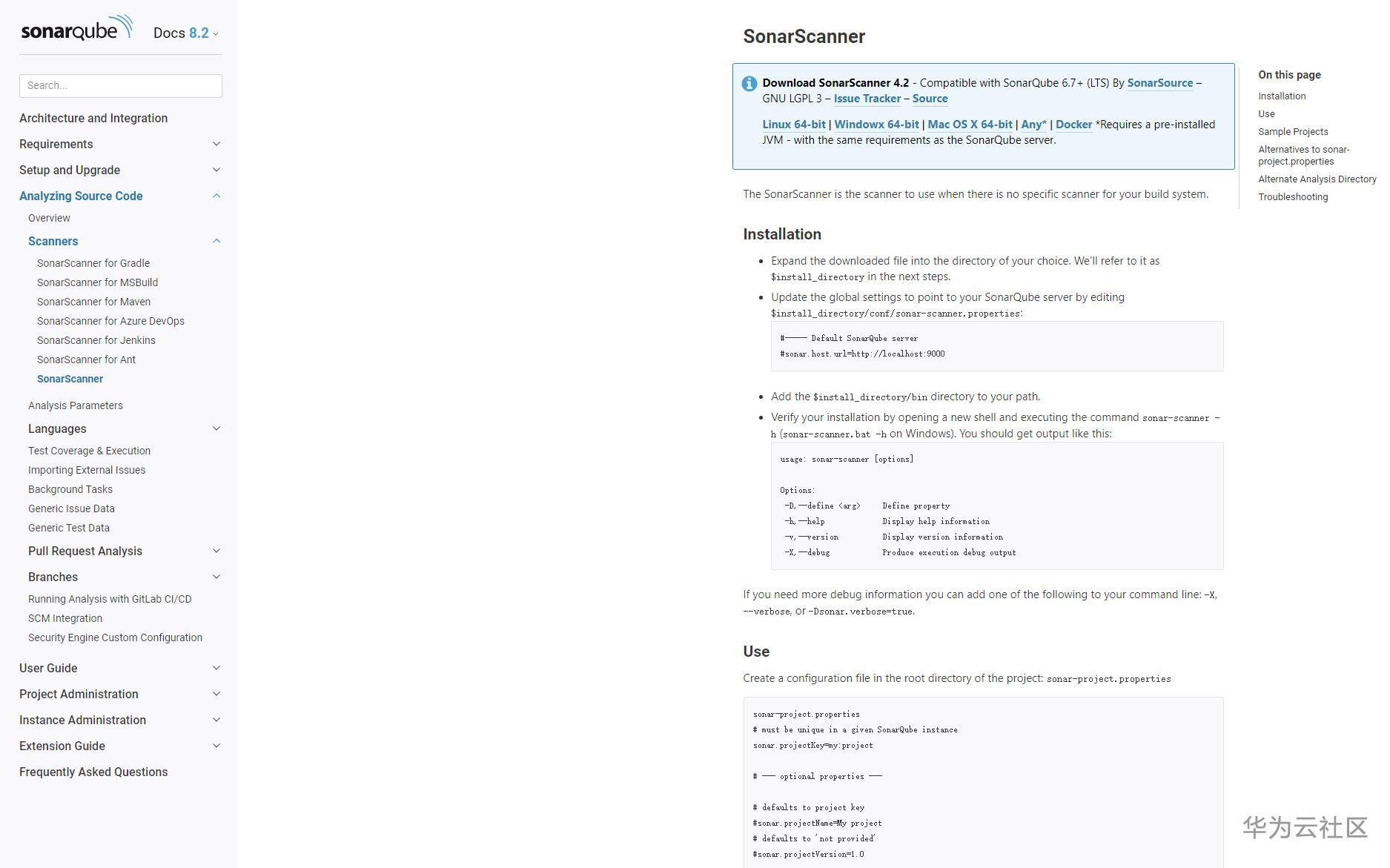 官网下载SonarScanner对应版本,注意不同语言有可能有不同的SonarScanner专用版本,导航栏左侧有提供不同语言的SonarScanner版本,另外要注意你要部署的SonarQube版本是否支持SonarScanner版本,地址是: https://docs.sonarqube.org/latest/analysis/scan/sonarscanner/