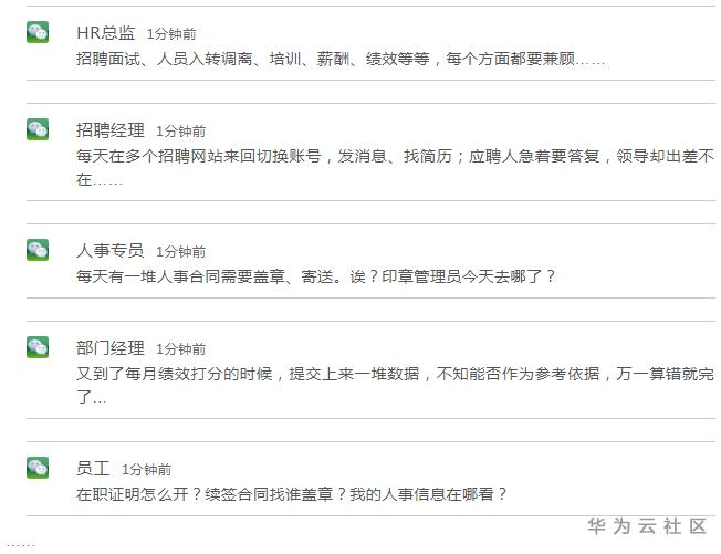 比如,快速发起各类人事自助业务,包括在职证明、收入证明等;或者发起相关申请,包括请假、加班、调休等;也可以查询个人的考勤、排班、公司的制度、培训安排等。