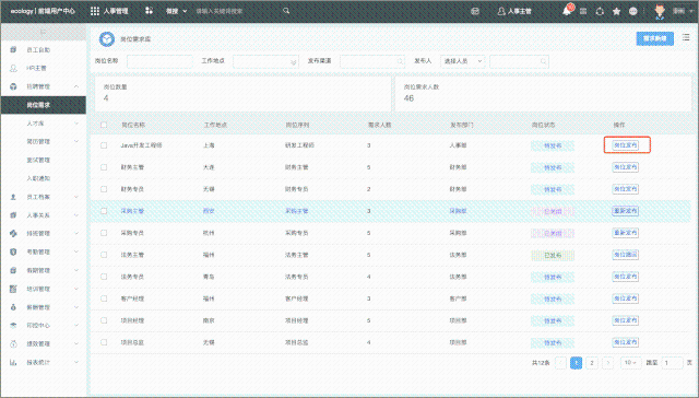 人事部门可汇总各个部门的用工需求,与外部网站进行对接,内部的岗位需求实现一键发布到外网,并可对岗位的需求状态持续跟进。