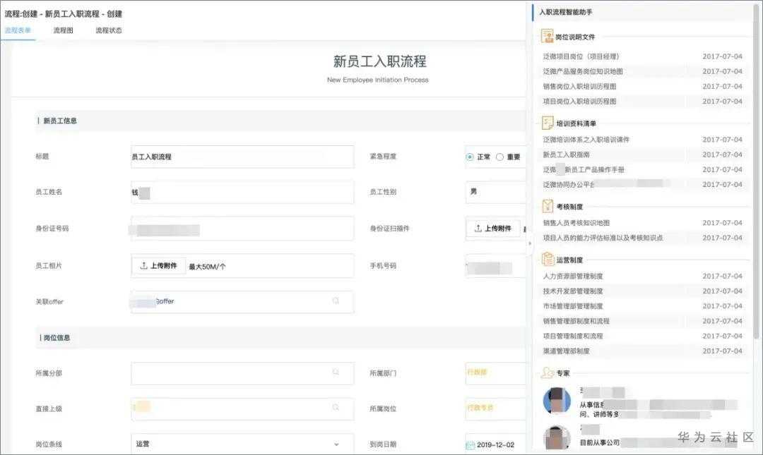 通过流程驱动人员状态和数据的变化与更新,员工信息从人才库智能抓取,实现入职、合同签署、系统账号开通、培训、考核、转正、转岗、离职的全程电子化。
