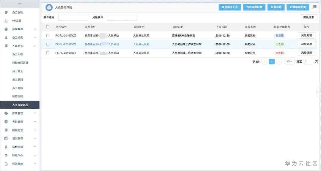 泛微OA的人事管理平台可以结合智能的风控模型,对接风险管理模块,自动从系统内部或其他异构系统中抓取数据,如考勤情况、工作状态等,智能识别出人员的异动风险,形成人员的风险识别库。自动推送至管理层的门户上,进行提醒与预警。
