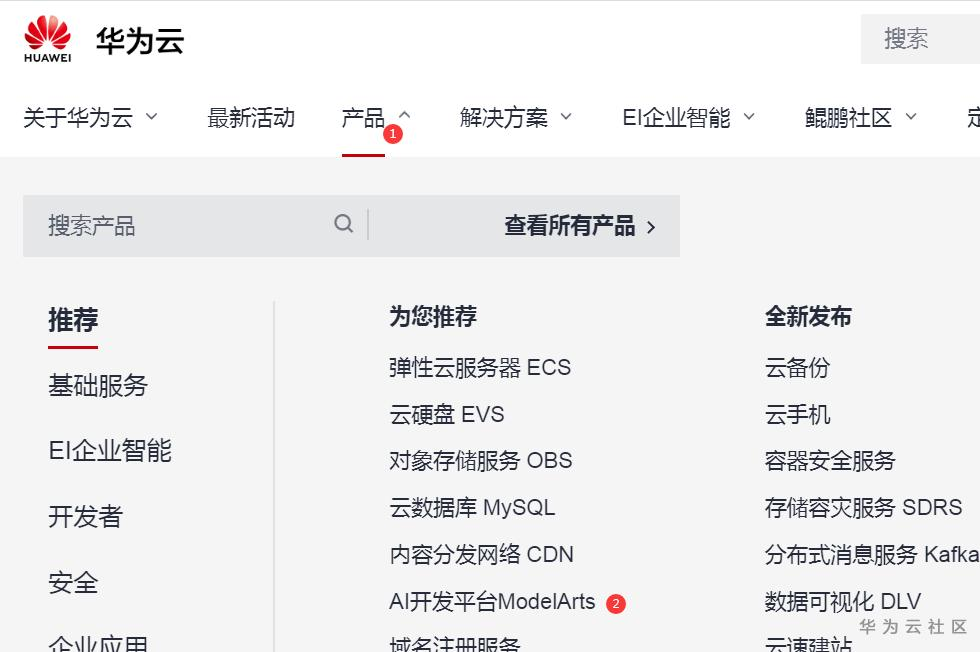 打开华为云首页,点击“AI开发平台ModelArts”