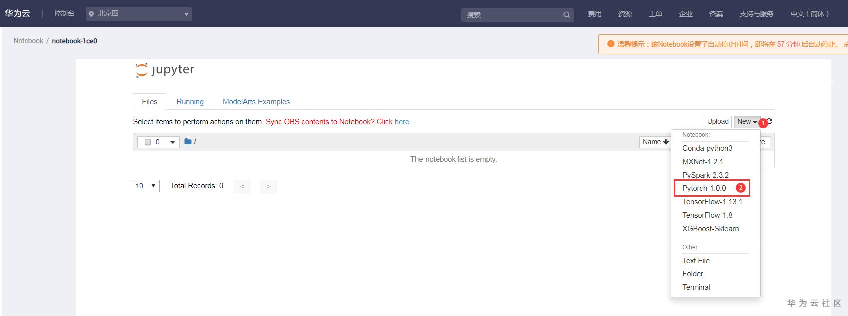 单击“Files”页签右上角“New”,选择“Pytorch-1.0.0”进入代码开发界面。