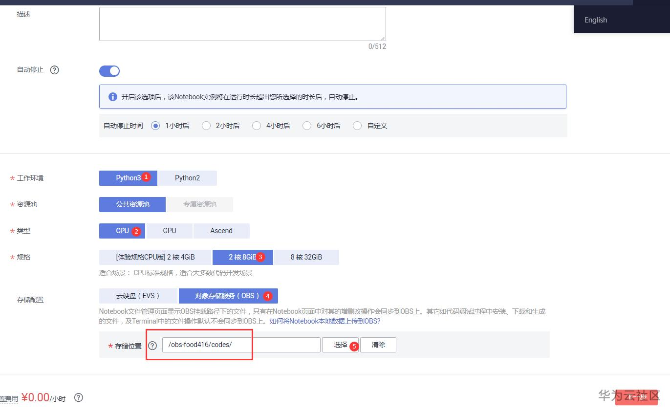 类型:CPU,存储配置:对象存储服务(OBS),存储路径选择:/obs-food416/codes/,选择好后,点击下一步,立即创建。