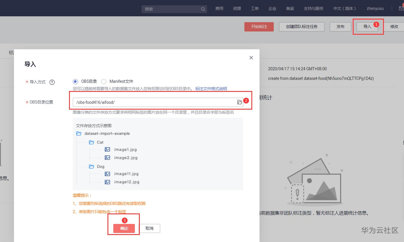 点击“导入”,导入方式选择:OBS,目录选择拷贝数据集位置:/obs-food416/aifood/,点击确认。