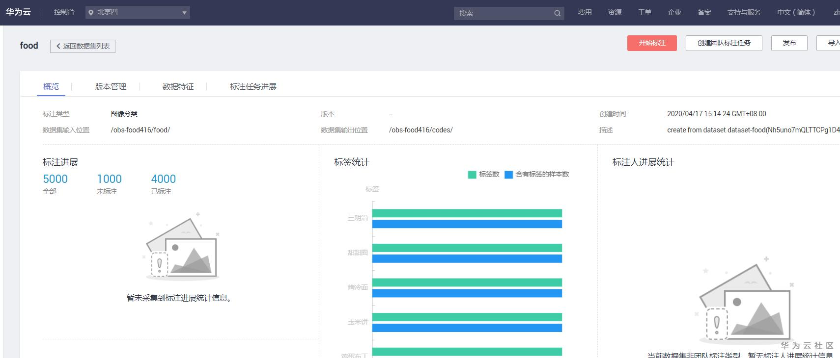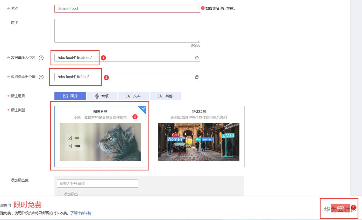 数据集输入位置选择之前拷贝的数据集位置:/obs-food416/aifood/,数据集输出位置,在obs中新建一个文件夹food,位置为/obs-food416/food/,标注类型选择分类,点击创建。