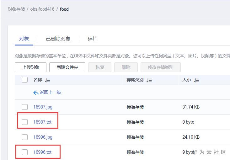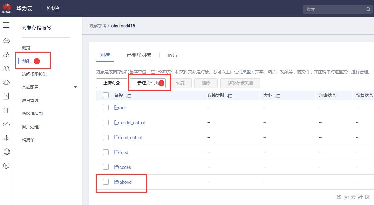 创建成功后点击桶名:obs-food416进入界面,点击对象,新建文件夹“aifood”、“codes”