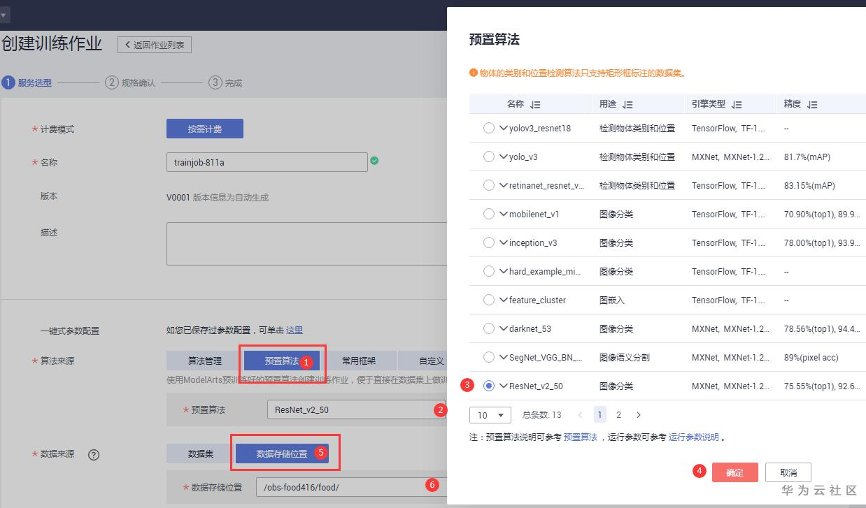 数据来源选择“数据存储位置”,选择上面标记过的数据存储位置:/obs-food416/food/