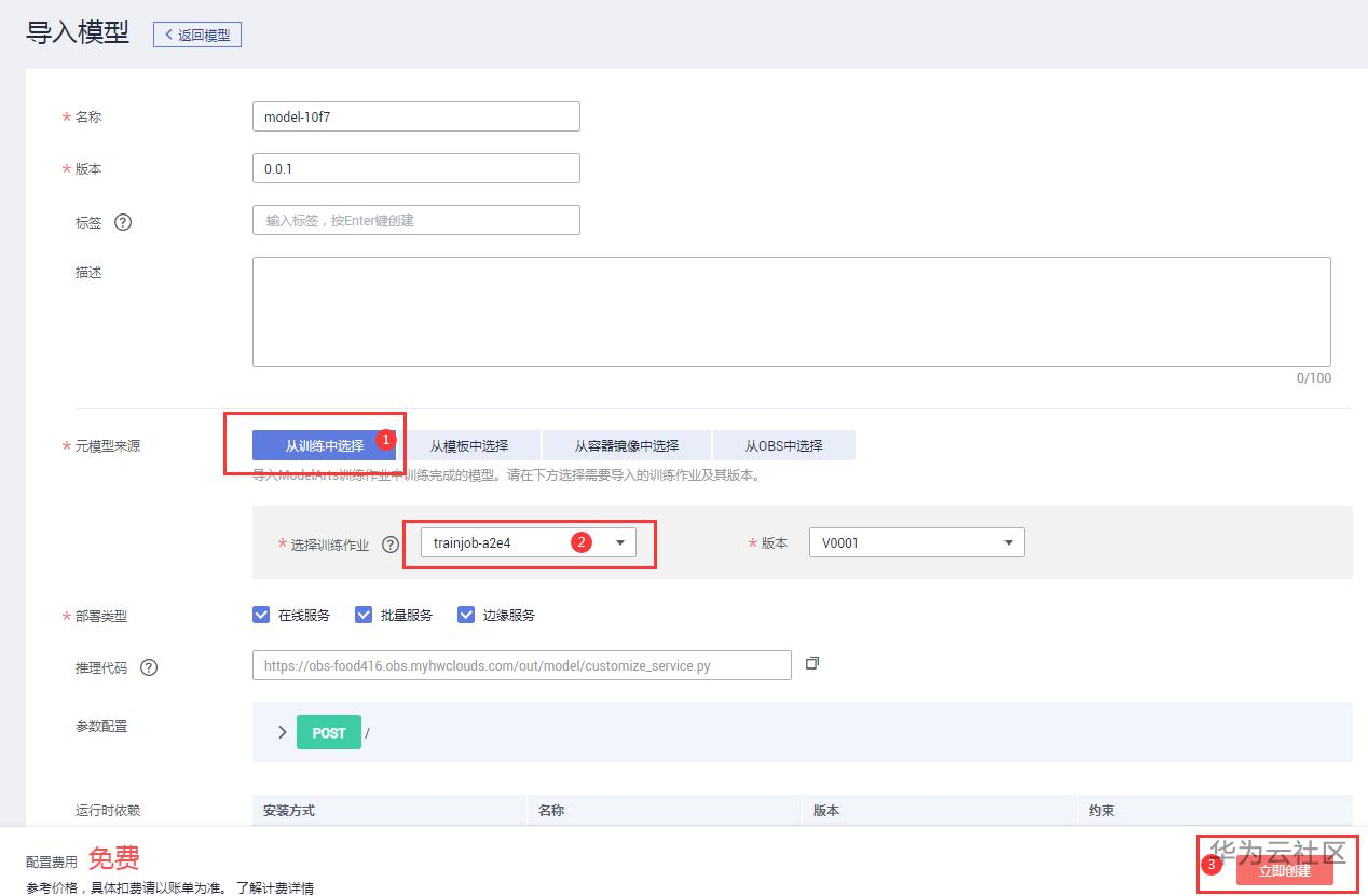 元模型来源选择“从训练中选择”,选择上一步训练得到的模型,点击立即创建。