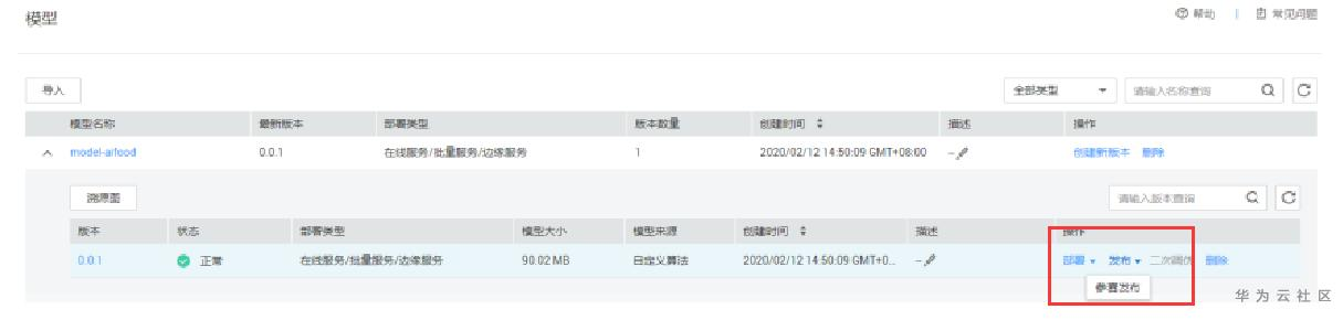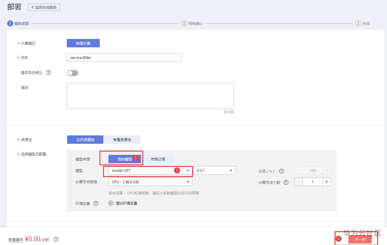 模型来源选择上面导入的模型,点击下一步--提交。点击查看服务详情。