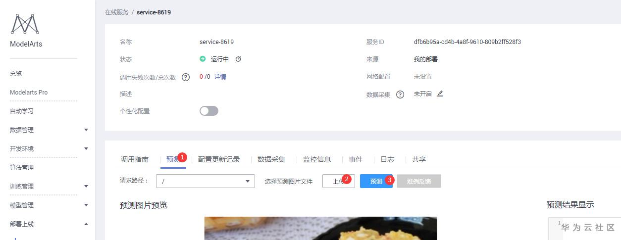 点击名称:service-8619,进入到预测页面,点击预测,选择上传要预测的图片,点击预测就可以看到训练的结果。