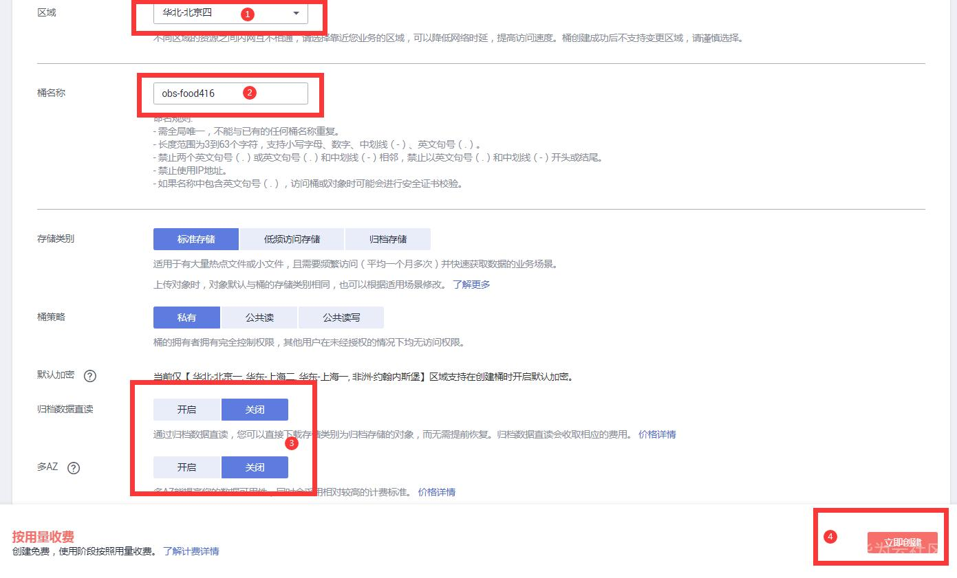区域:北京4,桶名自己定义,多AZ关闭,点击立即创建