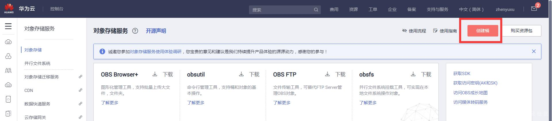 点击右上角“创建桶”,在OBS创建一个桶