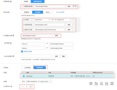 配置训练作业,选择专属资源池,计算节点为2代表分布式作业使用2台计算节点。