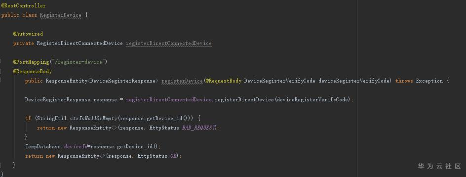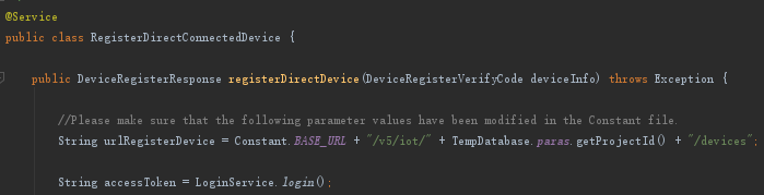 /register-device接口对应RegisterDevice类的registerDevice(@RequestBody DeviceRegisterVerifyCode deviceRegisterVerifyCode)函数,然后这个函数又调用了registerDirectConnectedDevice类的registerDirectDevice(DeviceRegisterVerifyCode deviceInfo)函数,调用了物联网平台的创建设备接口。