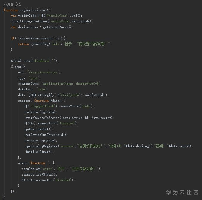 通过查看index页面源码,我们可以看到用户点击注册设备后应用会调用common.js中的regDevice( btn )函数,携带的参数就是用户输入的设备标识。这个方法会先检查你是否设置了参数,然后再调用/register-device接口。