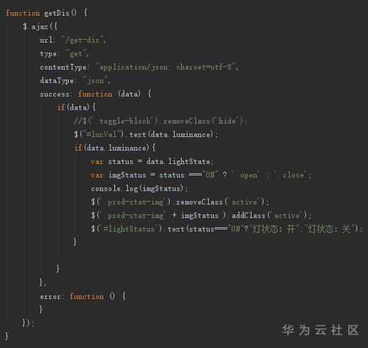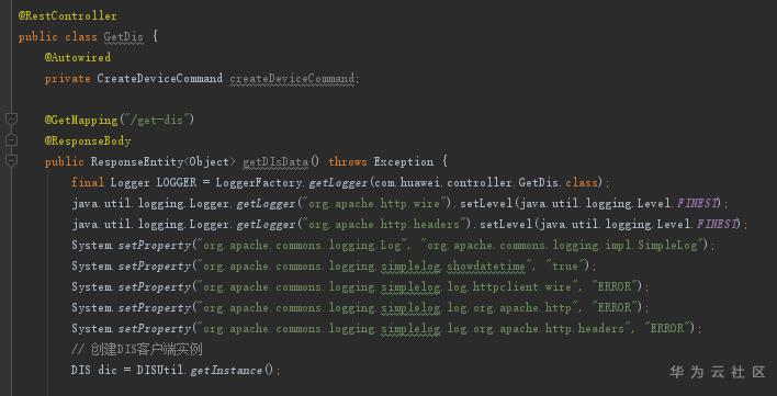 /get-dis接口对应GetDis类的getDIsData()函数,这个函数通过集成DIS的SDK,实现了从DIS通道或获取最新数据。这部分的实现可以直接参考DIS的文档,本文不进行详述。设备上报的数据从物联网平台转发至DIS通道则是基于数据转发规则,本文也不进行详述。(眼尖的同学可能会发现这个函数的最后有一行createDeviceCommand.runSetCommand(slMsg);这行代码涉及到这个应用的命令下发机制,此处暂不讲解)