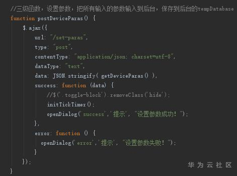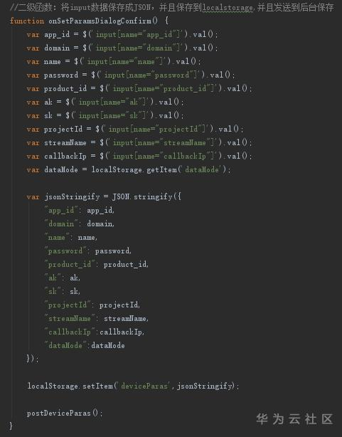将设置的数据保存到后台的函数是onSetParamsDialogConfirm(),先读取输入框的值,再写入本地存储,最后调用postDeviceParas()将数据传到后端供后端使用。